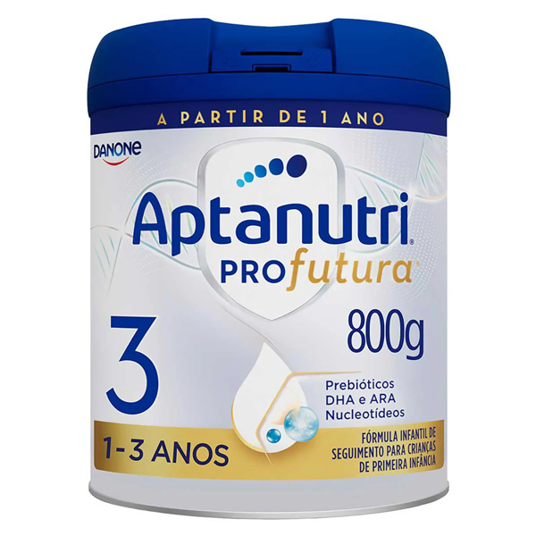 Fórmula Infantil Aptanutri Profutura 3 Danone 1 a 3 anos 800gO Aptanutri Profutura 3 é uma fórmula infantil que contém nutrientes como ARA e DHA de duas vezes mais absorção, além de nucleotídeos, prebióticos exclusivos Danone e Vitaminas A, B12 e C.R$ 85,49