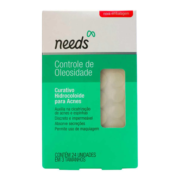 Curativo para Acne Needs Controle de Oleosidade 24 UnidadesO que é Curativo para acne Needs? Os curativos para Acne Needs são mini bolinhas adesivas para colocar sob a acne ou sob pequenas lesões e cortes na pele, ajudando na cicatrização e protegendo de infecções provocadas pela ação de bactérias. Além de ser discreto e impermeável, também absorve secreções e permite que a pele respire. Na embalagem, contém 24 curativos em 3 tamanhos diferentes:R$ 26,90